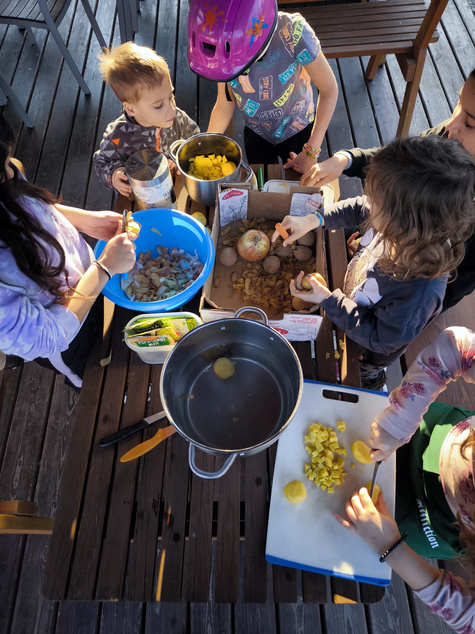 V pátek využily děti teplého jarního počasí a prázdninového volna k přípravě večeře v podobě domácího kotlíkového guláše. Pod vedením pedagogů se seznámily s postupem jeho přípravy, kterou následně realizovaly.